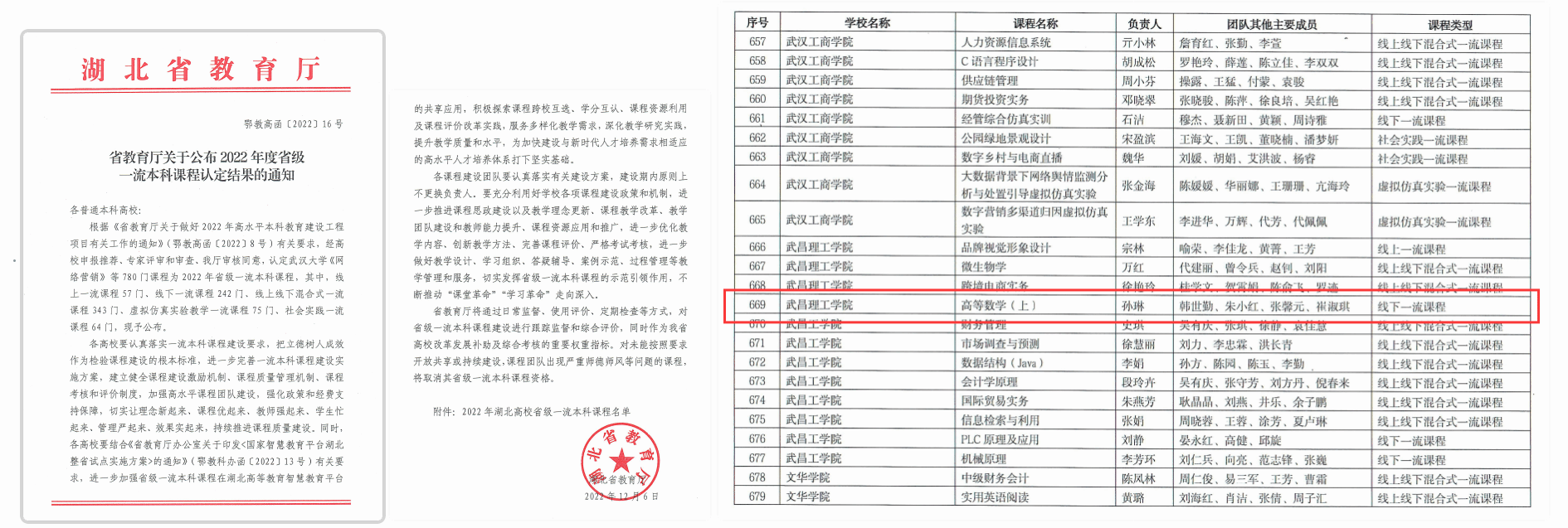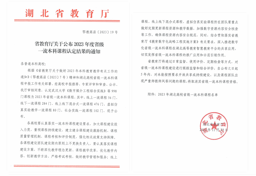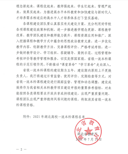 鄂教高函〔2021〕14号 省教育厅关于公布2021年度省级一流本科课程认定结果的通知(627号)