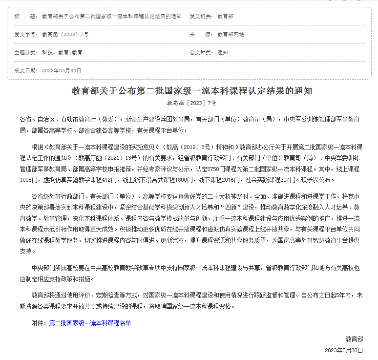 教育部关于公布第二批国家级一流本科课程认定结果的通知_国务院部门文件_中国政府网