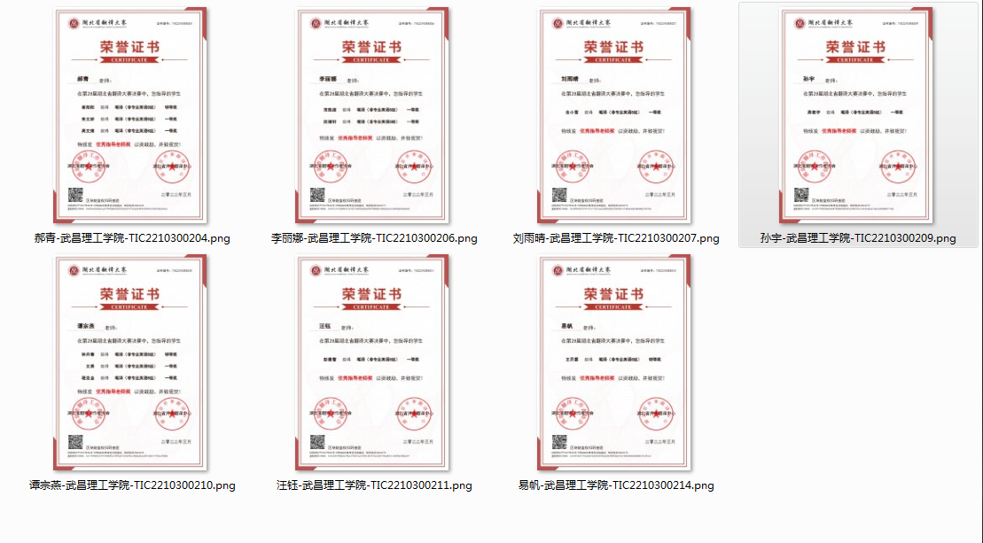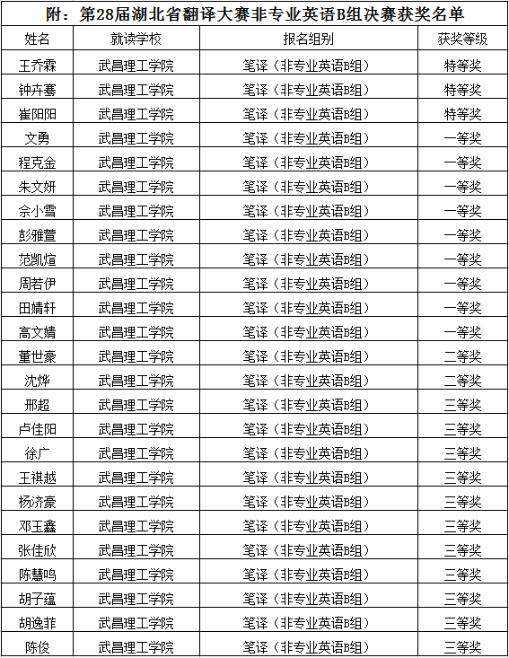 近日,湖北省翻译大赛组委员会公布了第28届湖北省翻译大赛决赛最终获奖名单。在经历了预赛、初赛和决赛的激烈角逐后,我校25名优秀学子在此次决赛非英语专业B组中脱颖而出,获得了特等奖3项、一等奖9项、二等奖2项、三等奖11项的优异成绩。大学英语课部易帆、谭宗燕、郝青等七位教师荣获“优秀指导教师奖”。