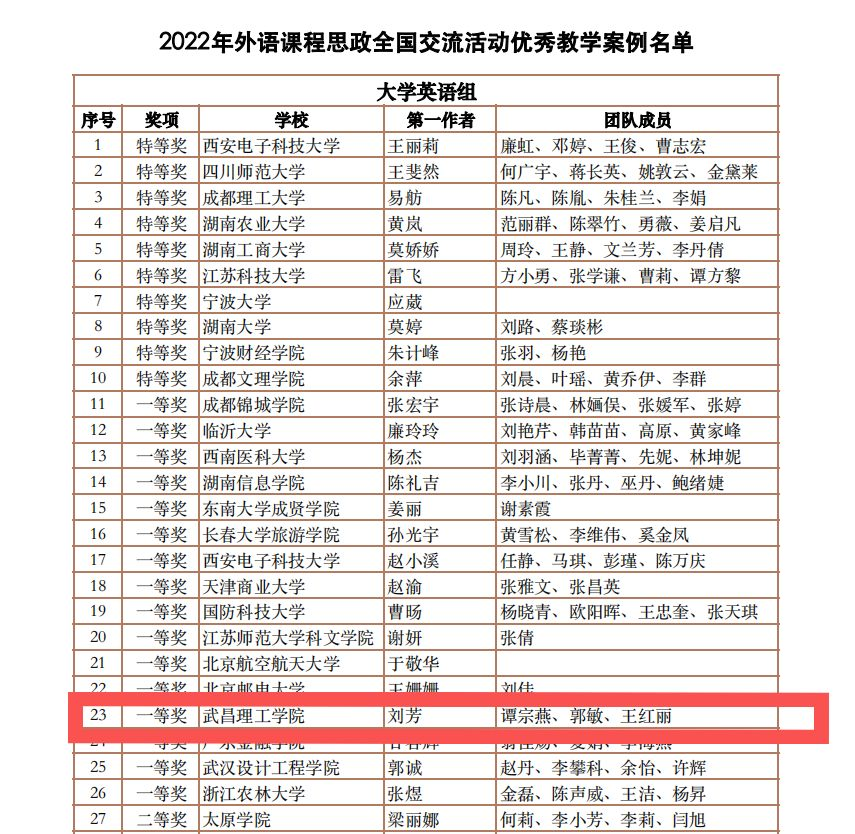 11月26—27日,由教育部高等学校大学外语教学指导委员会指导,高等教育出版社、全国高校教师网络培训中心和《中国外语》编辑部主办的“2022年高等学校(本科)外语课程思政优秀教学案例征集与交流活动”在线上成功举办。ylg060net永利娱高大学英语课部刘芳教师团队(刘芳、郭敏、谭宗燕、王红丽)再创佳绩,荣获2022年高等学校外语课程思政优秀教学案例征集与交流活动全国一等奖(全省同类院校唯一)。