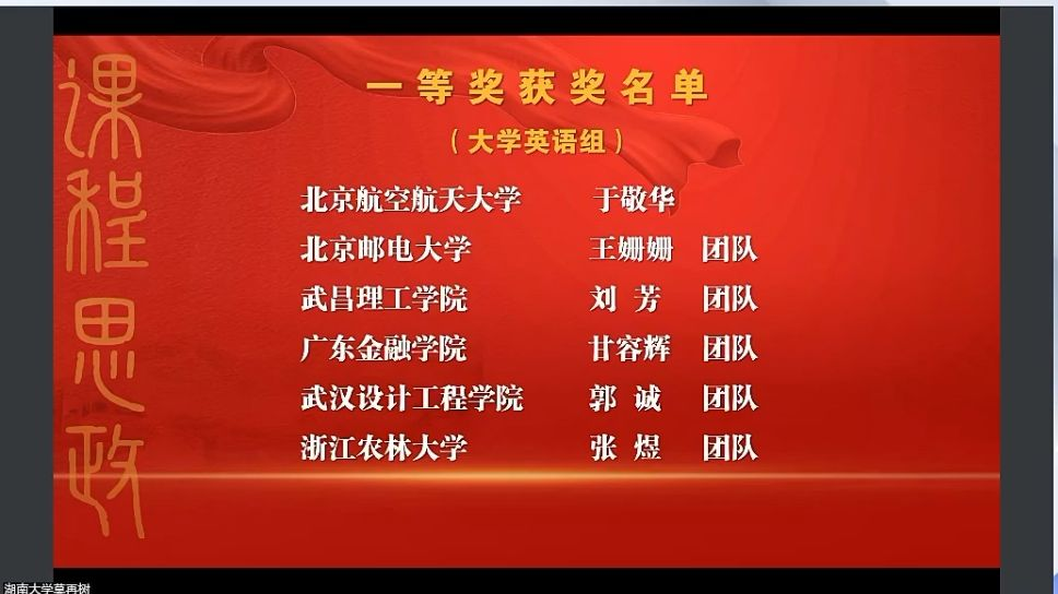据悉,该教师团队经过层层考验,通过比赛的前两个阶段,以湖北省特等奖的优异成绩获取第三阶段全国评审与交流活动资格。在全国交流活动中,郭敏老师代表团队进行了线上说课和答问环节,与大学英语组的其他50支团队进行了激烈的角逐,最终荣获全国一等奖,这是我校大学英语课部今年获得的最新荣誉。此次大赛湖北省仅有4所高校进入最后的全国决赛,能在众多高校中脱颖而出,这无疑是对我校师资力量的肯定。成功的背后是教师们的辛勤付出,该教师团队为此次比赛准备良久,从五月份比赛拉开序幕就一直采用线上线下研讨相结合,探讨方案,反复斟酌,为修改作品不断提出更优良、更精细的建议。最终作品以灵活的教学方法、新颖的教学模式、清晰的教学过程及润物细无声的思政教学博得一众好评,一举拿下全国一等奖。