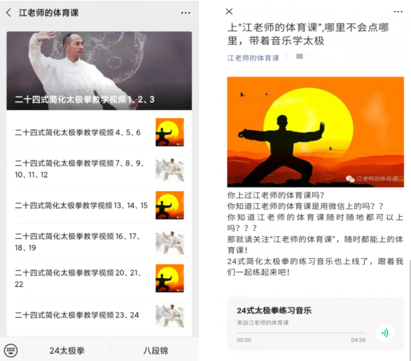 为了使学生能掌握体育课堂学习内容、动作要领、体育锻炼方法等,江监老师专门开设了“江老师的体育课”微信公众账号,让学生们能随时随地学、课内课外学、线上线下学。在平台上,根据教学内容,上传标准动作分节示范等,方便学生学习,帮助学生建立正确的技术动作,有效的提高运动技能,增强学生对动作技术的感知能力,学生们都评价江老师的微信平台可以“哪里不会点哪里”。3月9日开课以来公众号已有近2000人关注,总的点击量为6436。