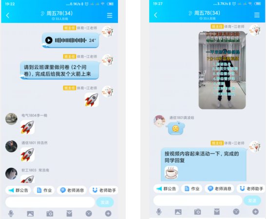 课堂上在重点讲授内容及知识点时,会采用当下流行的线上教育互动模式让学生快速回应“666”、“红心”或者“小火箭”,以确保学生在线率和参与度,同时采用边讲解边测试的方法,讲解完一个知识点,就让学生在云班课回答问题或是进行动作展示,并对问题和展示动作进行讲解,增强师生之间的互动交流,提高学生与体育理论及技能知识的兴趣和欲望,以为确保学生课堂学习效果。
