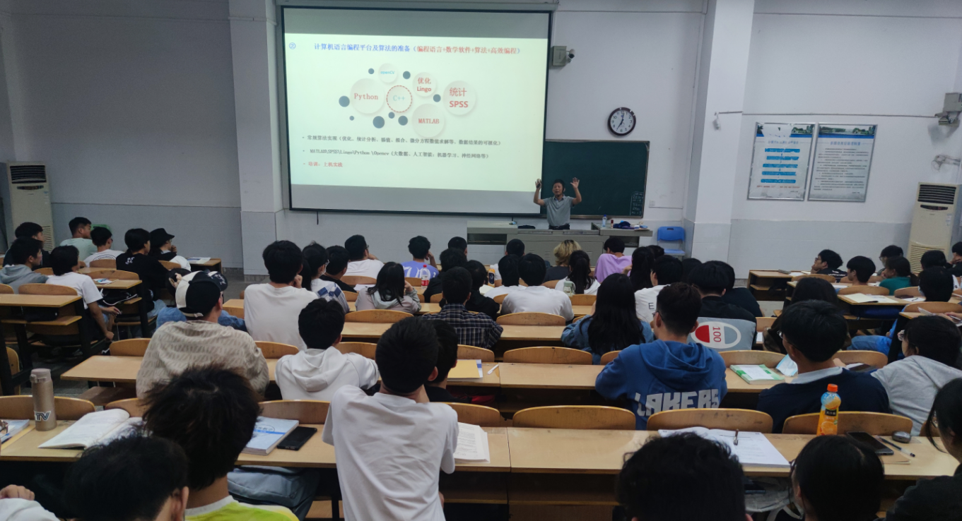 讲座开始后,羿教授首先从大家熟悉的人工智能专业入手,从数学建模的角度,循序渐进引出数学建模的步骤、时代特点和重要性,激发大家学模型、建模型、用模型的极大热情。其次,羿教授以三个数学建模例子,简要介绍了数学建模在智能机器人技术、无人机技术和机器学习等领域的前沿应用。然后,羿教授简要介绍了近几年全国大学生数学建模竞赛和我省参赛的有关情况,他强调,大学生数学建模竞赛是一项面向全国学生群体的学术竞赛活动,是广大学生探索解决实际问题、开展学术交流、提高创新能力和培养团队意识的有效平台。同时,他还系统普及了数学建模基本理论和方法,结合历届全国大学生数学建模竞赛试题,详细讲解了计算机语言及算法设计、MATLAB软件学习、论文写作技巧及注意事项等。最后,羿教授从建模培训和模拟训练的角度,讲授了参加建模竞赛需注意的若干问题,以及需培养的知识扩展、实践创新、算法设计、问题求解和论文写作等能力。他指出,较为精确的模型往往需要考虑多方面的因素,基于模型驱动的算法往往需要具备较为全面的数学知识,也需要掌握一定的数学软件和编程技巧。通过建模学习和培训,能极大地扩展大家的知识面,提升学习能力、实践能力、创新能力、协作能力,正因为如此,大学生数学建模竞赛才得到了社会、高校以及大学生的广泛认可。